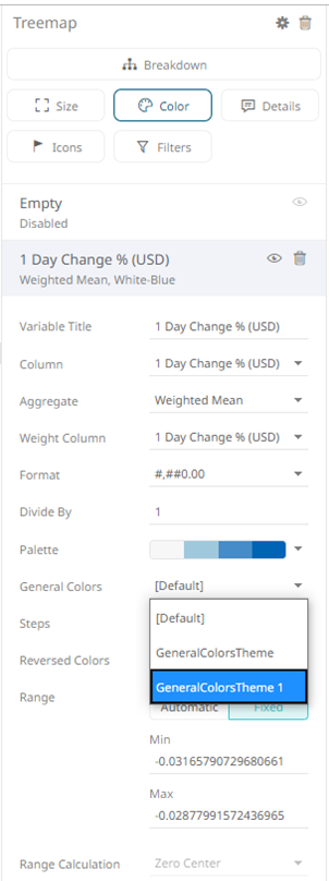 Once the new theme is saved and selected in the opened workbook, all of the defined General Colors will be added as options in the General Colors drop-down list of a Color variable in a visualization.