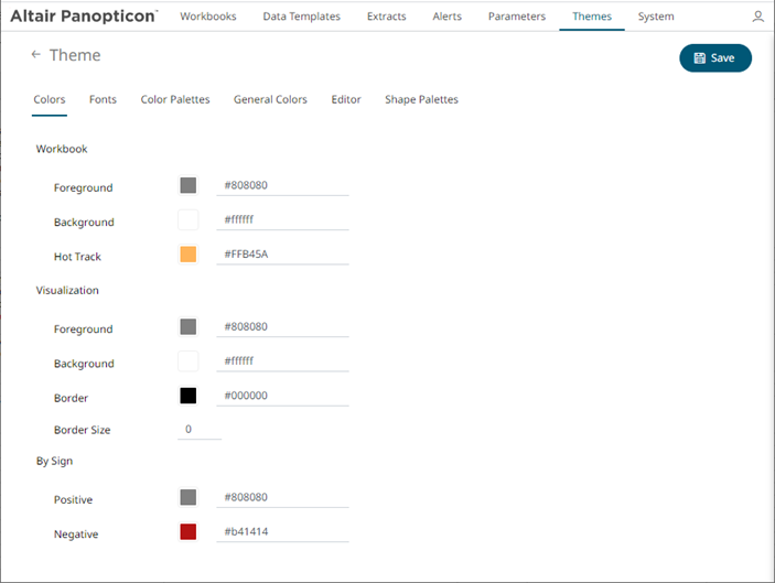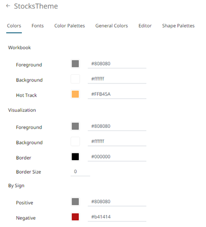 Creating a new theme allows setting the colors, fonts, color palettes, general colors, and shape palettes to be used in workbooks and visualizations.