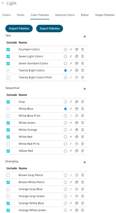 The text, sequential, and diverging color palettes that is used in text or numeric color variables in visualizations can be created, modified, duplicated, or deleted in the Color Palettes tab of a Theme page.
