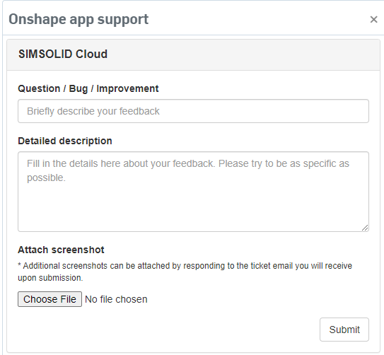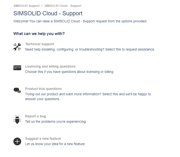 Pick the SimSolid Cloud support channel to open a new ticket or pick