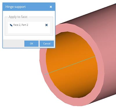 Hinge supports allow a part to freely rotate about the center-line of a cylindrical face but constrains movement in both the radial and axial directions. Hinge supports can only be applied to full or partial cylindrical faces. The cylindrical faces may be either concave or convex.
