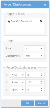 Both force and prescribed displacement are defined in a single dialog. Force is defined as a load on the model. The specified value is interpreted as a total force applied to all selected part faces. Loads and prescribed displacement can be specified in global X, Y and Z directions only.