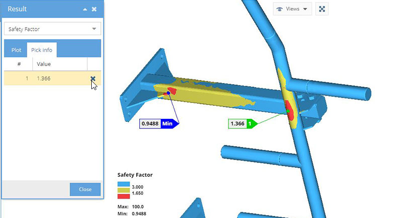 SimSolid Cloud safety factor plots are used to characterize zones of