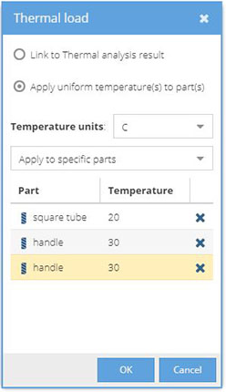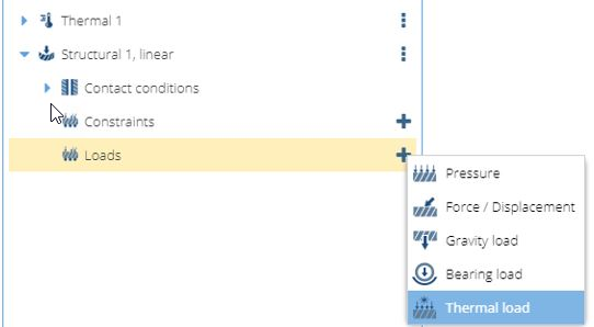 Only one thermal load can be applied to a model. Once applied, the Thermal load can be edited or deleted through the action menu on the Thermal Load item in the Project Tree.