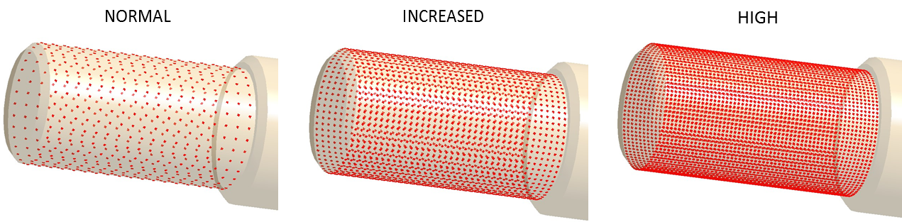 In the majority of cases, the default Normal resolution is adequate. Note that Increased is 4X the density of Normal and High is 16X denser. More complex boundaries slow down solution time. It is recommended that the resolution level be only increased locally where required and try Increased first then High as a last resort.