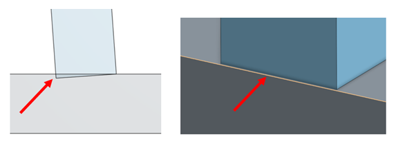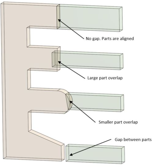 SimSolid Cloud is very tolerant of part geometry imperfections. Small gaps or overlaps between parts can be easily accommodated. Using only 3 parameters (gap tolerance, penetration tolerance and connection resolution), SimSolid Cloud creates a proprietary connection entity between each part in the assembly. Then, with each solution pass, the traction forces in the connection are measured and the solution is locally adjusted to minimize solution errors in the boundaries. In this way an accurate solution is obtained on the real, not merged, geometry. Examples of permitted connections are shown in Figure 3 and Figure 4.